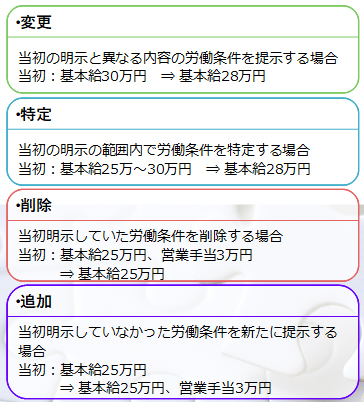 雇い入れの際に労働条件を明示する義務は労働基準法に規定されていますが、今回の改正職業安定法の施行により、求人募集で明示した内容を変更、特定、削除、追加するようなときは、その内容を求職者が適切に理解できるように明示することが義務付けられました。これを「労働条件の変更明示」といいます。具体的には、以下のようなケースが該当します。