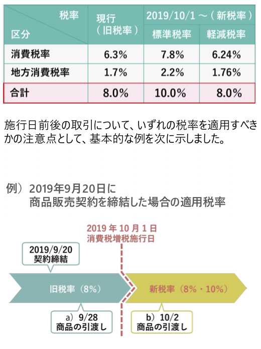 このように、商品販売契約の締結が10月1日前であったとしても、商品の引き渡しが10月1日以後に行われる場合には、新税率が適用されます。