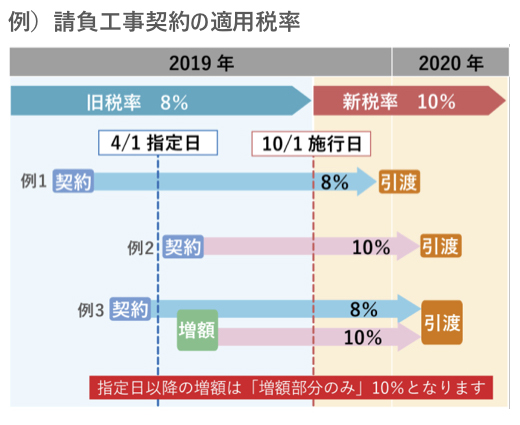 消費税10%の増税日(2019年10月1日)の半年前の4月1日を指定日として、その前日の3月31日までに契約すれば、増税日以降の引渡しでも消費税は8%となります。 つまり、施行日以後であっても旧税率が適用されるのが「経過措置」です。 例えば、請負工事の場合、工事を完成して引き渡した時の消費税率等の税率が適用されます。しかし、指定日である2019年4月1日の前日2019年3月31日までに契約を締結した一定の請負工事は、「経過措置」が適用され、施行日以後の引き渡しであっても原則として旧税率が適用されます。