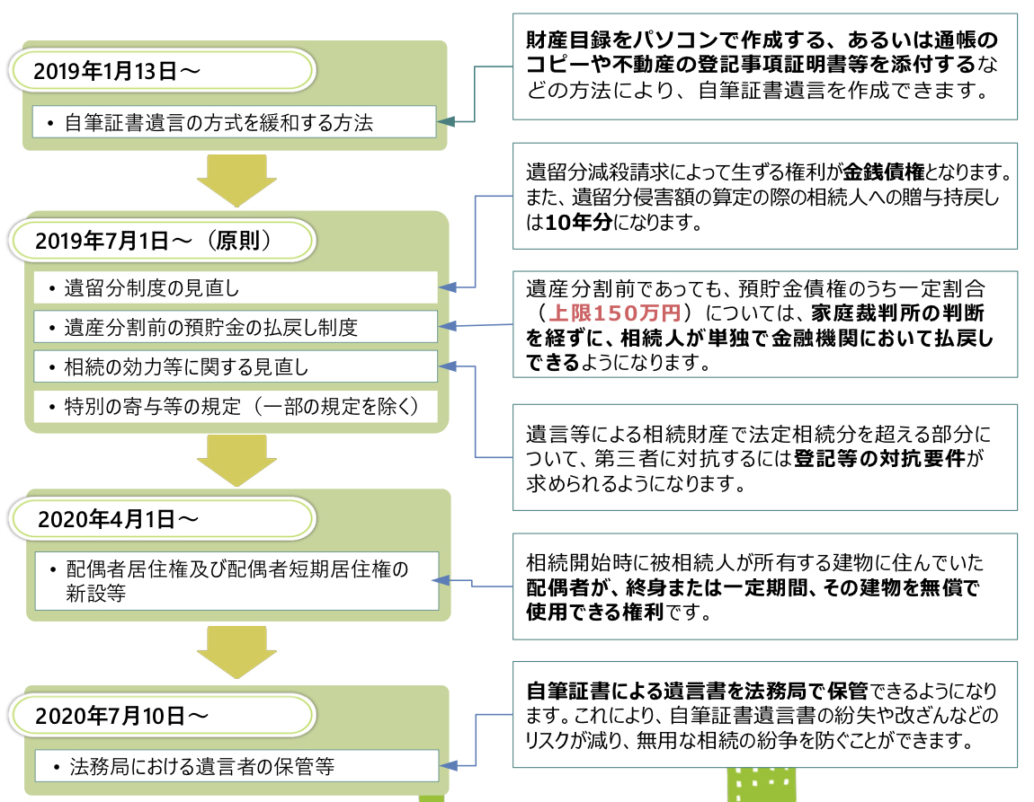 2018年7月に相続法(民法)の大改正が行われ、その施行日が決まりました。残された配偶者や家族が安心して生活を送れるよう、新しい制度が導入されます。主な改正事項を施行日順にご紹介します。2019年1月から段階的に施行
