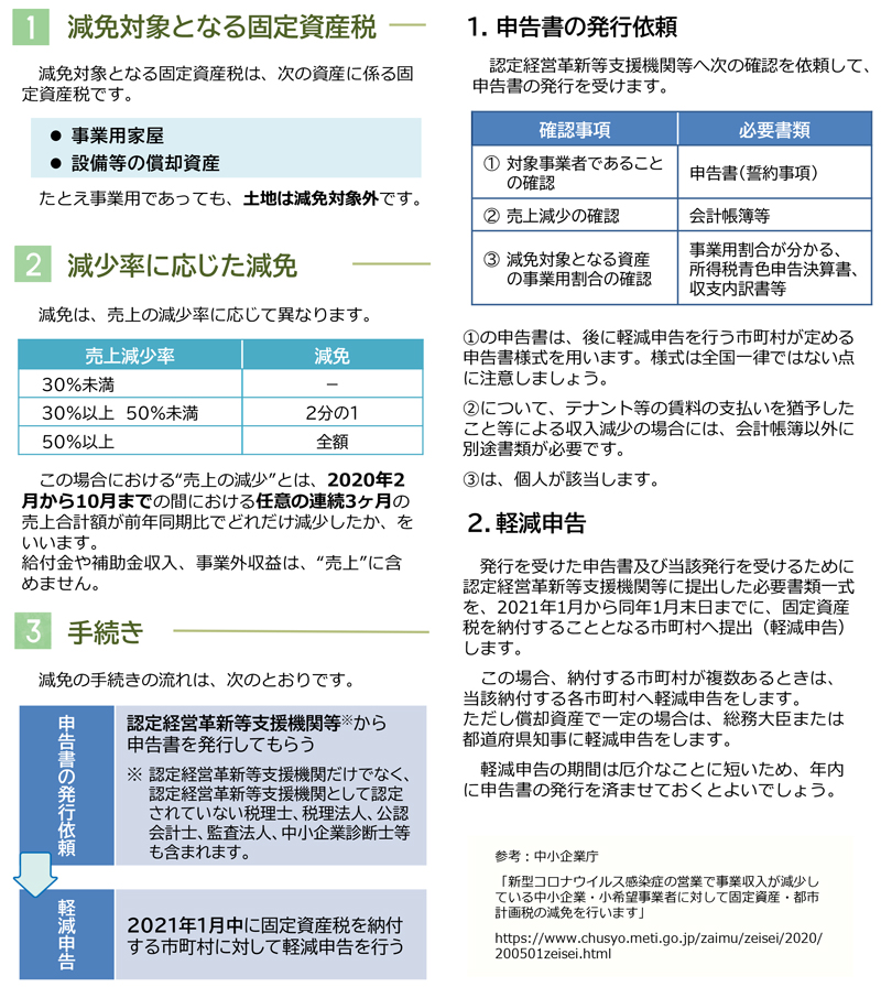 新型コロナウイルス感染症の影響により売上が落ち込んだ中小企業等の事業者に対し、当該減少率に応じて2021年度の固定資産税(都市計画税を含む)を申告することにより減免してもらえる救済措置が設けられました.