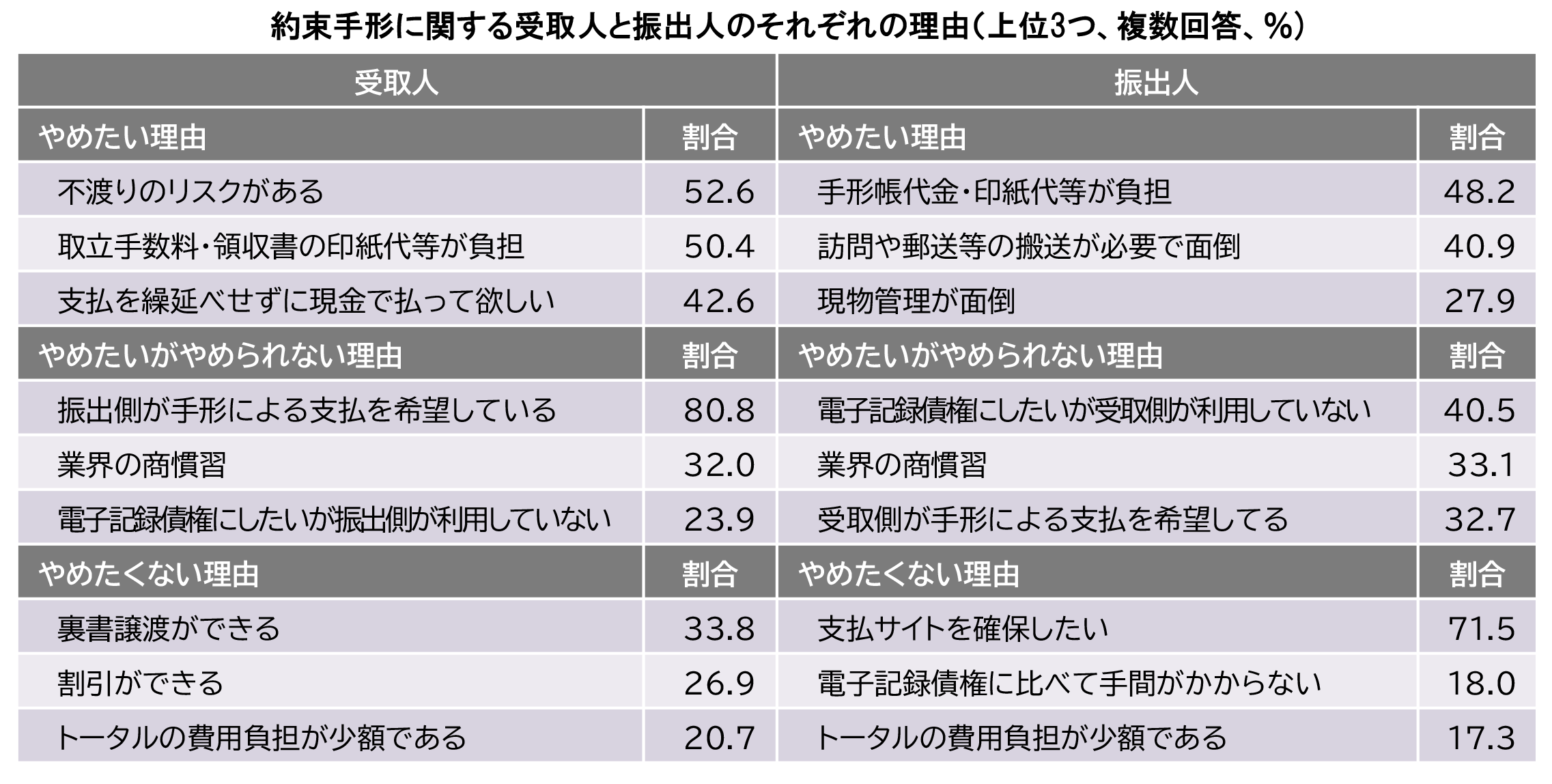 約束手形を利用しながらもその実、利用をやめたいとも考える企業が多いようです。ここでは、2021年3月に発表された報告書※から、手形を利用している企業の利用に関する意向をご紹介します。 中小企業庁「約束手形をはじめとする支払条件の改善に向けた検討会報告書」