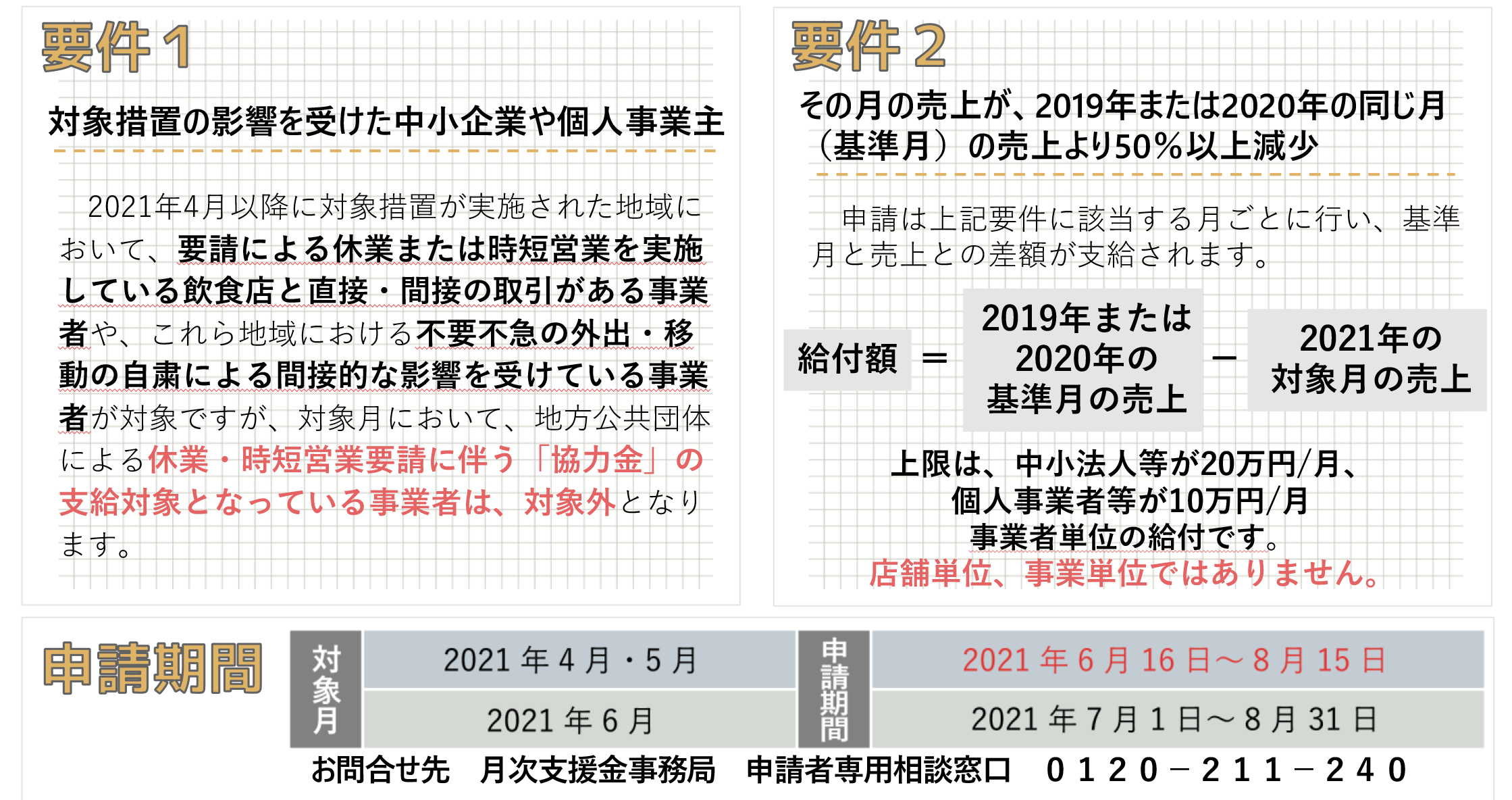 今年4月以降の緊急事態措置やまん延防止等重点措置(以下「対象措置」という)で大きな痛手を被った中小企業や個人事業主のために、新たな支援策「月次支援金」が始まります。 “対象要件は2つ”業種・所在地を問わず支給の対象になります
